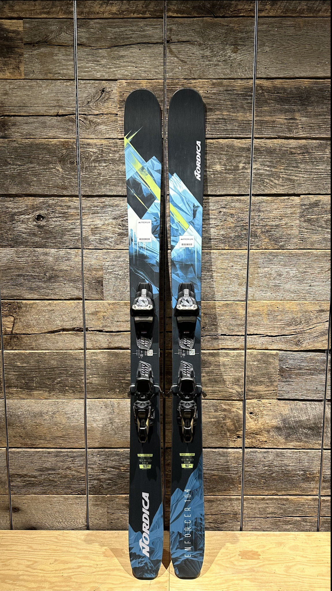 This Nordica Enforcer 104 comes from the rental fleet at Premium Mountain Rentals in Whistler and was used for just one season. The skis are mounted with Marker Squire 11 bindings, which are fully adjustable to fit most adult boot sizes, making setup easy with no remount required.